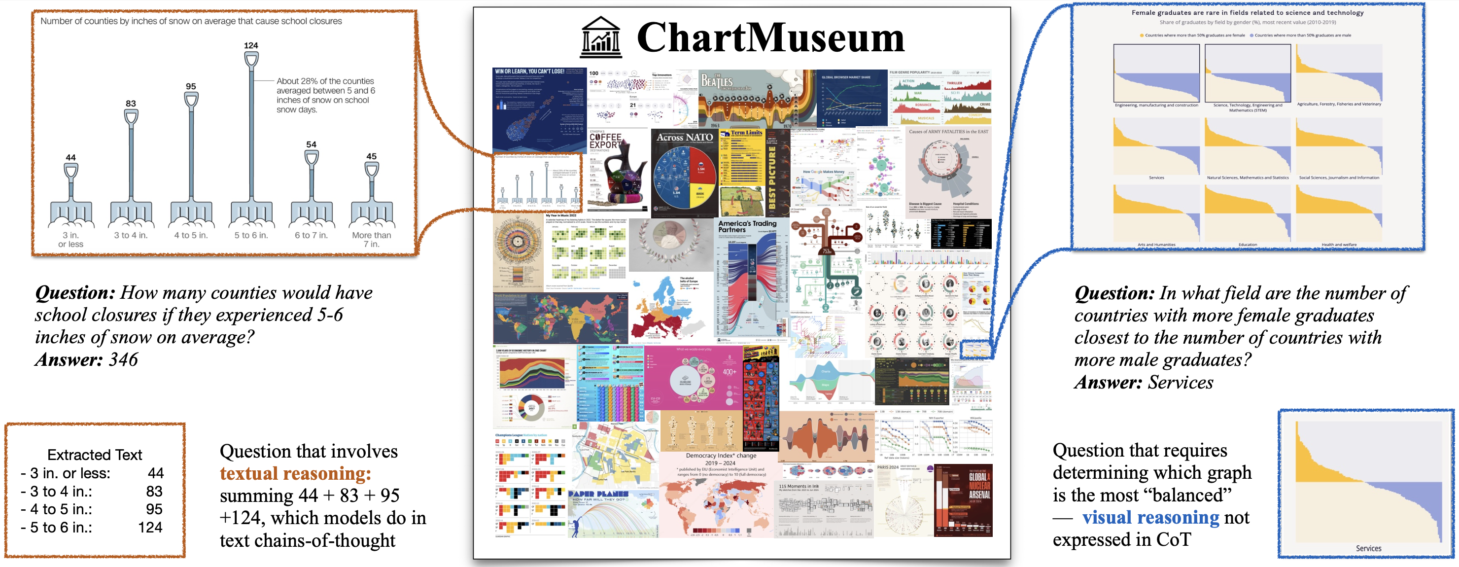 Human overall accuracy on ChartMuseum is 93%, with 98.2% on the visual reasoning questions. Examples from ChartMuseum are available here.